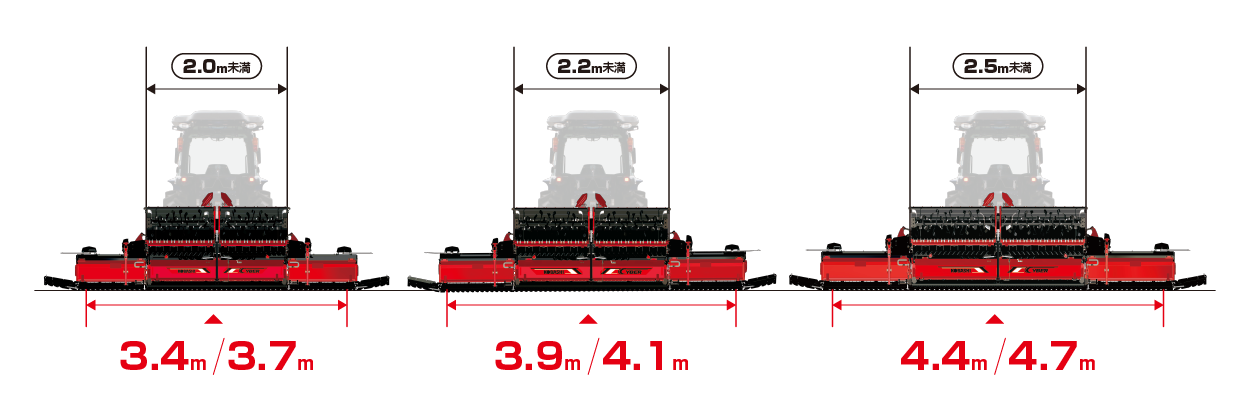当社中型クラス最長となる作業幅4.7mモデルが新たに登場。従来製品と比べて、一度に作業できる面積が大幅に拡大し、限られた時間や人手でも、効率的な代かき作業が可能です。